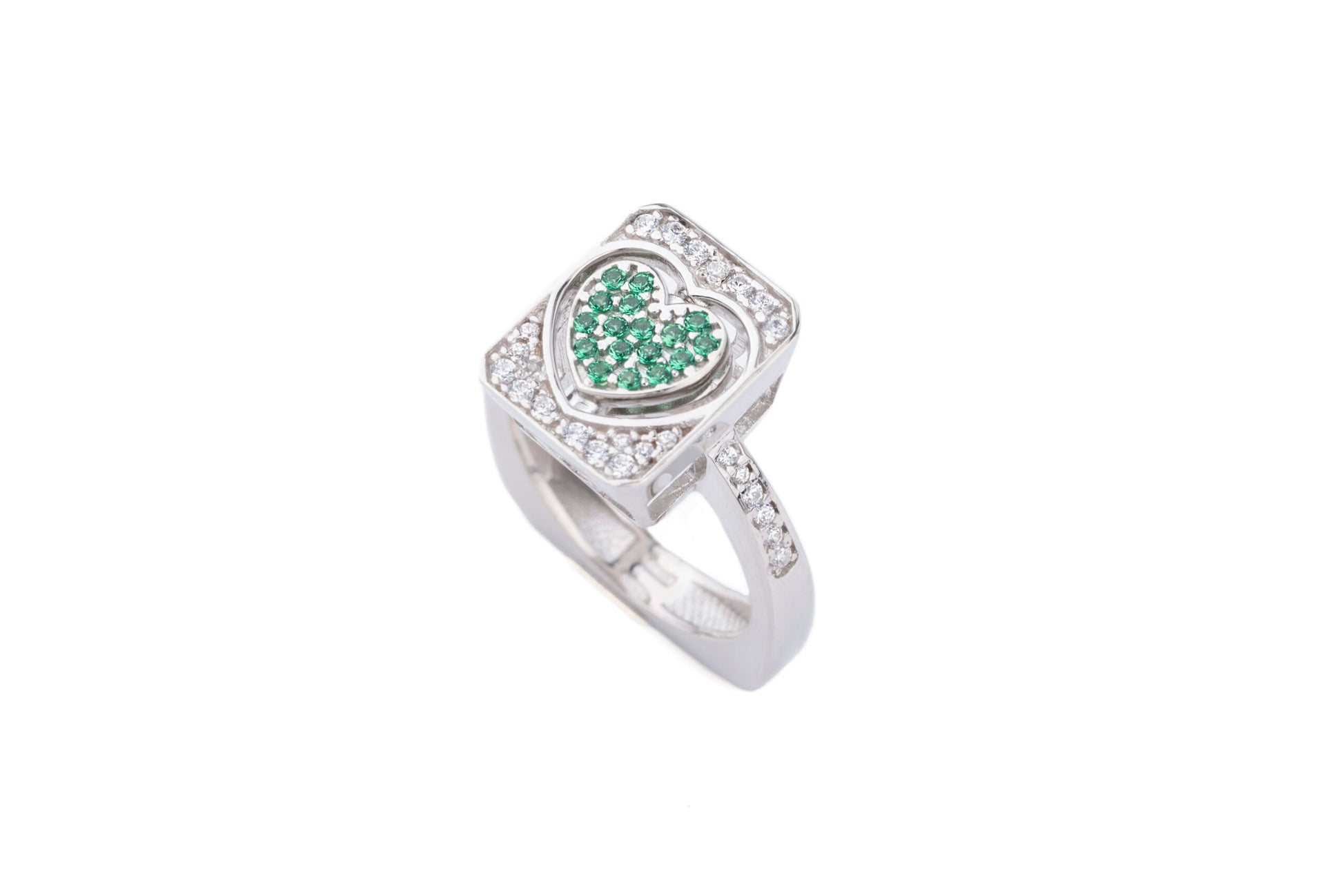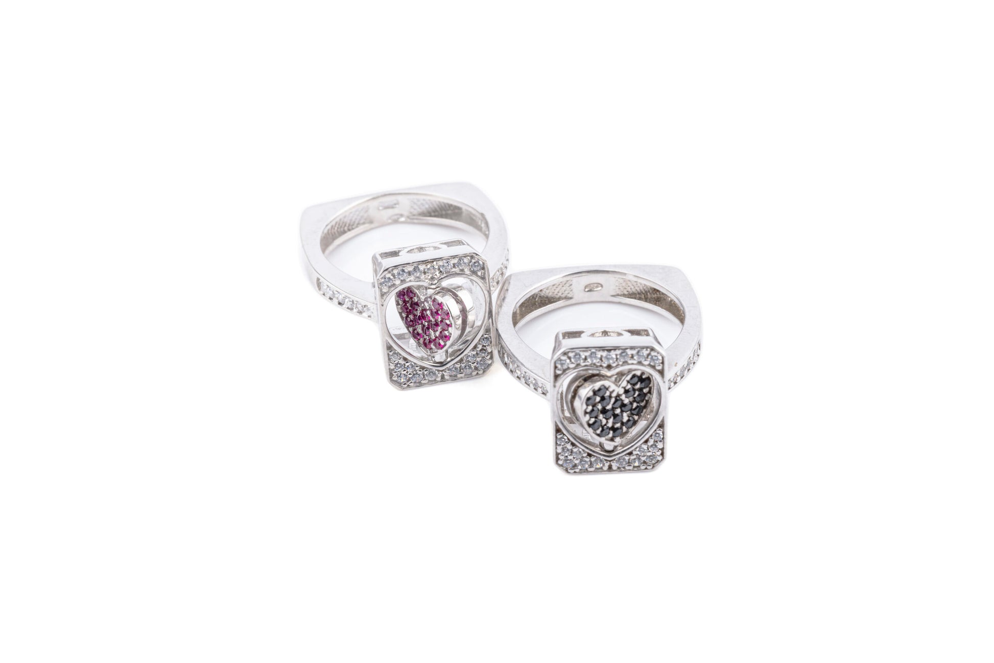 Anello in argento 925 con pavé bianco e colorato. Il cuore ha la possibilità di ruotare e mostrare così il suo secondo colore. Combinazioni disponibili: bianco e nero, bianco e rosso, bianco e blu, bianco e verde.