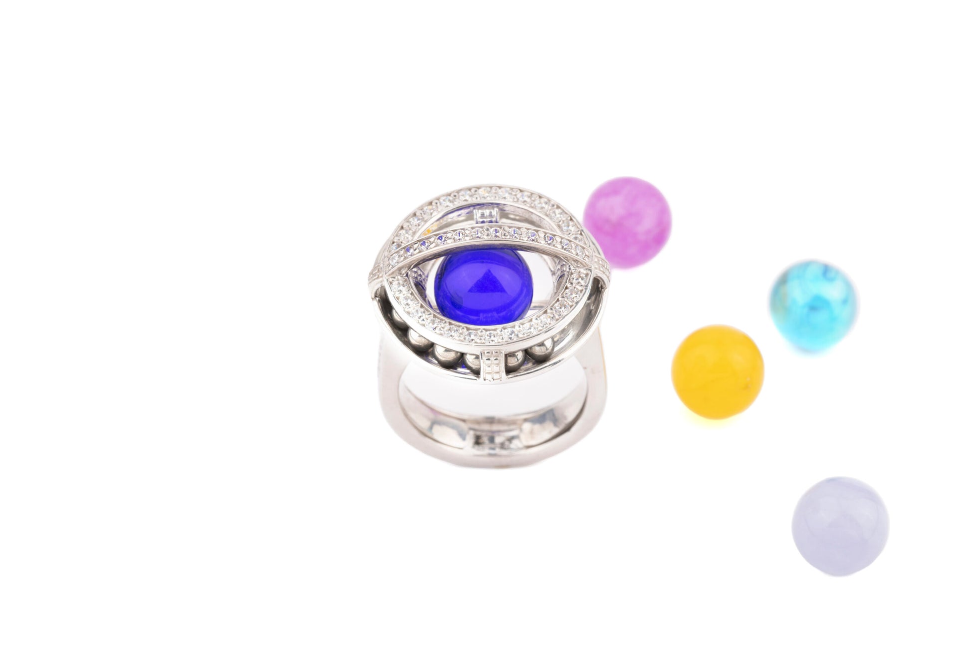 Anello in argento 925 rodiato oppure é disponibile placcato in oro rosa 18k, ispirato al movimento planetario e dedicato a Galileo Galilei incluse nel prezzo ci sono tre sfere di colorazioni differenti, si prega di indicare la selezione dei colori nella sezione "note". Un concept di design e movimento sulle tue dita. Accessorio perfetto per chi ama i gioielli personalizzati e dinamici. Grazie ad un semplice meccanismo potrai cambiare la sfera centrale, scegliendo il colore giusto per il tuo abbinamento.